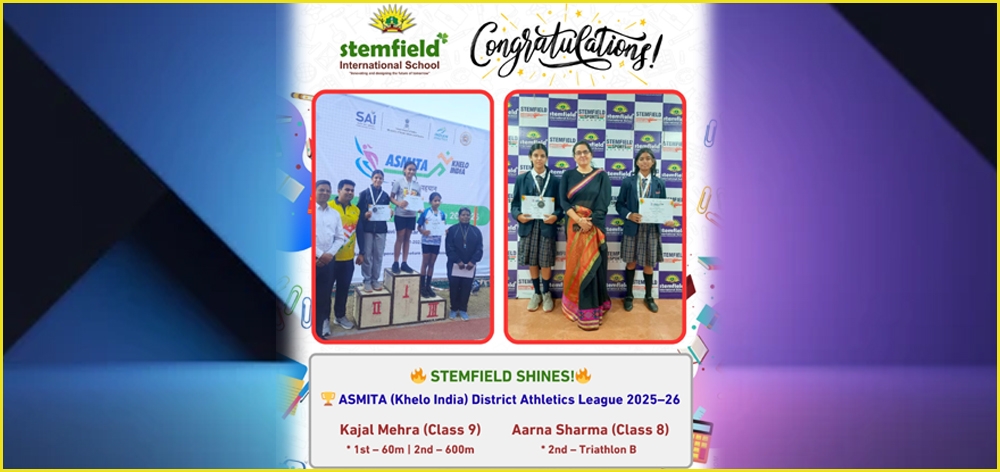 STEMFIELD SHINES AGAIN! Our young athletes have set the track on fire at the AMITA (Khelo India) District Athletics League 2025–26 Pandit Ravishankar Shukla Stadium, Jabalpur Achievements of Our Champions: 1.Kajal Mehra (Class 9) * 1st Place – 60m Race * 2nd Place – 600m Race 2. Aarna Sharma (Class 8) * 2nd Place – Triathlon B The Management congratulates our young achievers and blesses them for many more successful milestones ahead. |