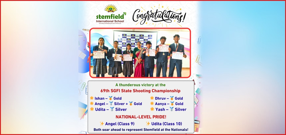 MEDAL RAIN FOR STEMFIELD! Open Sight Rifle – U14 Boys * Ishan Dubey (Class 8) – Gold Team Medal Open Sight Rifle – U14 Girls * Angel Patel (Class 9) – Silver Individual * Gold Team Medal Open Sight Rifle – U19 Girls * Udita Patel (Class 10) – Silver Individual Open Sight Rifle – U19 Boys * Dhruv Agrawal (Class 11) – Gold Team Medal Air Pistol – U19 Girls * Aanya Tripathi (Class 12) – Gold Team Medal Air Pistol – U19 Boys * Yash Wardhan (Class 11A) – Silver Team Medal SUPER PROUD MOMENT! Our stars Udita Patel (Class 10) and Angel Patel (Class 9) have qualified for the National Level! The Management congratulates all the shooters and extends heartfelt gratitude to Team Gun for Glory for their exceptional training and support |