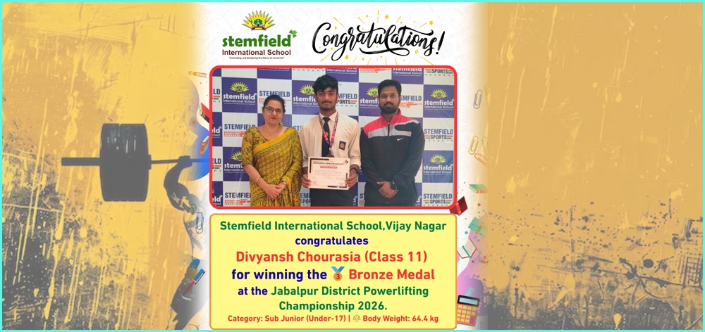 Pride and celebration fill the air at Stemfield International School, Vijay Nagar as yet another talented student brings laurels to the institution through his remarkable achievement. Divyansh Chourasia, a dedicated student of Class 11, showcased exceptional strength, determination, and sportsmanship at the Jabalpur District Powerlifting Championship 2026. Category: Sub Junior (Under-17) Body Weight: 64.4 kg Achievement: Bronze Medal The School Management wholeheartedly congratulates Divyansh on this wonderful achievement and wishes him many more victories and greater success in future competitions. |