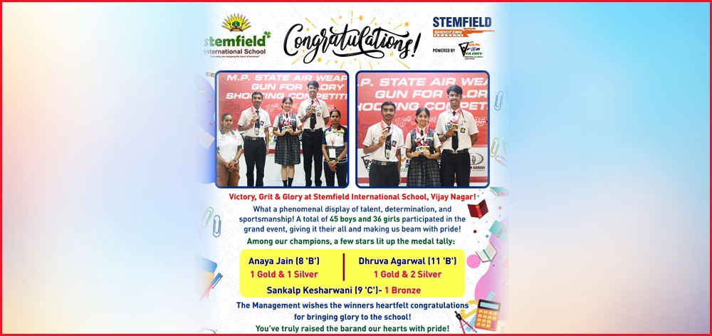Victory, Grit & Glory at Stemfield International School, Vijay Nagar! What a phenomenal display of talent, determination, and sportsmanship! A total of 45 boys and 36 girls participated in the grand event; giving it their all and making us beam with pride! ???? Among our champions, a few stars lit up the medal tally: Anaya Jain (8 'B') – 1 Gold & 1 Silver Dhruva Agarwal (11 'B') – 1 Gold & 2 Silver Sankalp Kesharwani (9 'C') – 1 Bronze The Management wishes the winners heartfelt congratulations for bringing glory to the school! You’ve truly raised the bar — and our hearts with pride! |