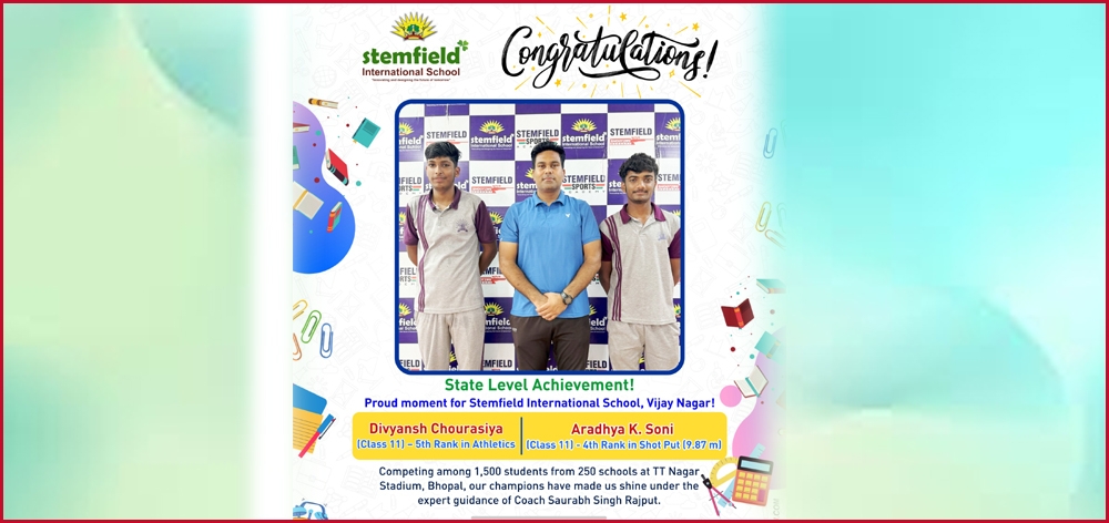 Stemfield Shines at State Level! Students of Stemfield International School, Vijay Nagar made us proud at the CBSE Cluster Event held at TT Nagar Stadium, Bhopal, where over 1,500 students from 250 schools participated. Divyansh Chourasiya (Class 11) – Secured 5th Rank in Athletics Aradhya K. Soni ( Class 11) – Secured 4th Rank in Shot Put with an impressive 9.87 m throw Their dedication and hard work have brought glory to the school at the State Level. Management congratulates both of them and wish them continued success ahead! |