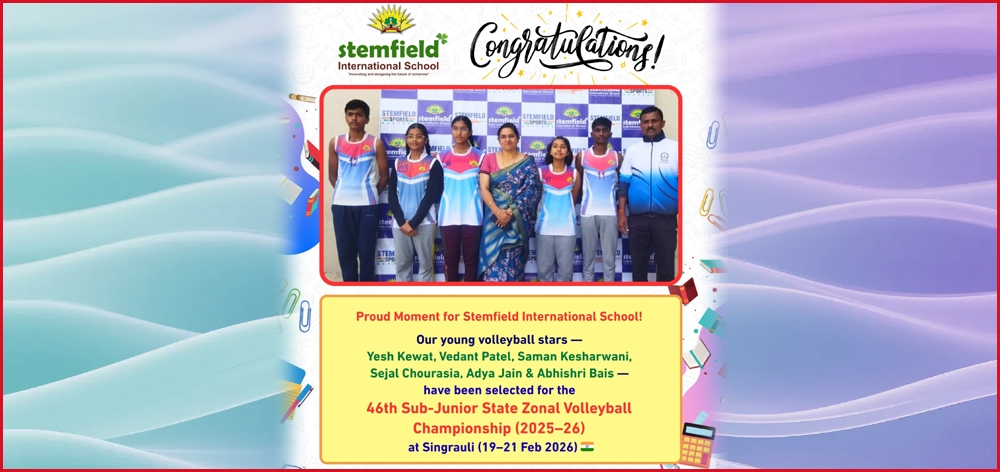 Stemfield International School, Vijay Nagar young volleyball stars have been selected for the 46th Sub-Junior State Zonal Volleyball Championship (2025–26) organized by the Volleyball Federation of India. Venue: Singrauli Date: 19th February to 21st February 2026 Our Star Players Boys Team: Yesh Kewat – Class 9 Vedant Patel – Class 9 Saman Kesharwani – Class 9 Girls Team: Sejal Chourasia – Class 7 Adya Jain – Class 9 Abhishri Bais - Class 9 The Management heartily congratulated the students on their remarkable achievement and extended their best wishes for outstanding performance in the championship |