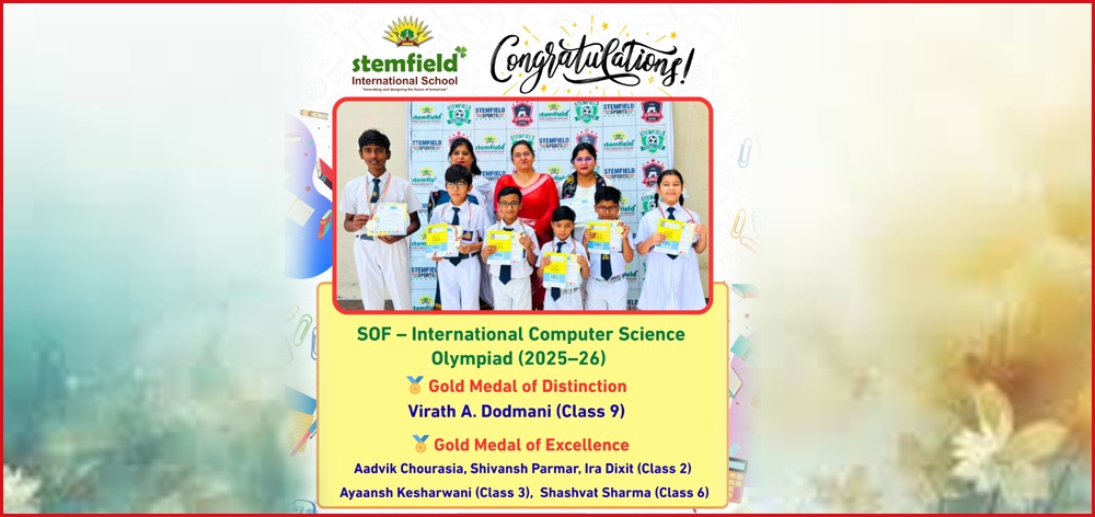 Celebrating Our Computer Champs! SOF – International Computer Science Olympiad (2025–26) Medal Winners List Stemfield International School, Jabalpur Gold Medal of Distinction Class 9 Virath A. Dodmani School Rank: 1 | Zonal Rank: 21 | International Rank: 383 Gold Medal of Excellence Class 2 Aadvik Chourasia School Rank: 1 | Zonal Rank: 27 | International Rank: 74 Shivansh Parmar School Rank: 2 | Zonal Rank: 36 | International Rank: 106 Ira Dixit School Rank: 3 | Zonal Rank: 121 | International Rank: 367 Class 3 Ayaansh Kesharwani School Rank: 1 | Zonal Rank: 142 | International Rank: 798 Class 6 Shashvat Sharma School Rank: 1 | Zonal Rank: 109 | International Rank: 1331 Congratulations to all our achievers for their outstanding performance and for bringing pride to the school. |