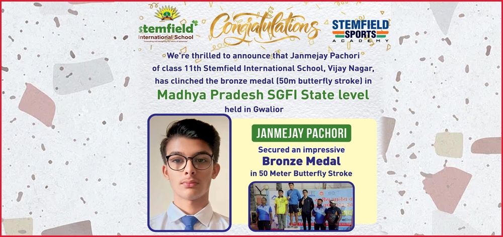 We are thrilled to announce that Janmejay Pachori of Class 11th Stemfield International School, Vijay Nagar, has clinched the Bronze Medal (50m Butterfly Stroke) in Madhya Pradesh SGFI State level held in Gwalior. Kudos to Janmejay for his outstanding achievement! The management is overjoyed and extends their warmest congratulations. |